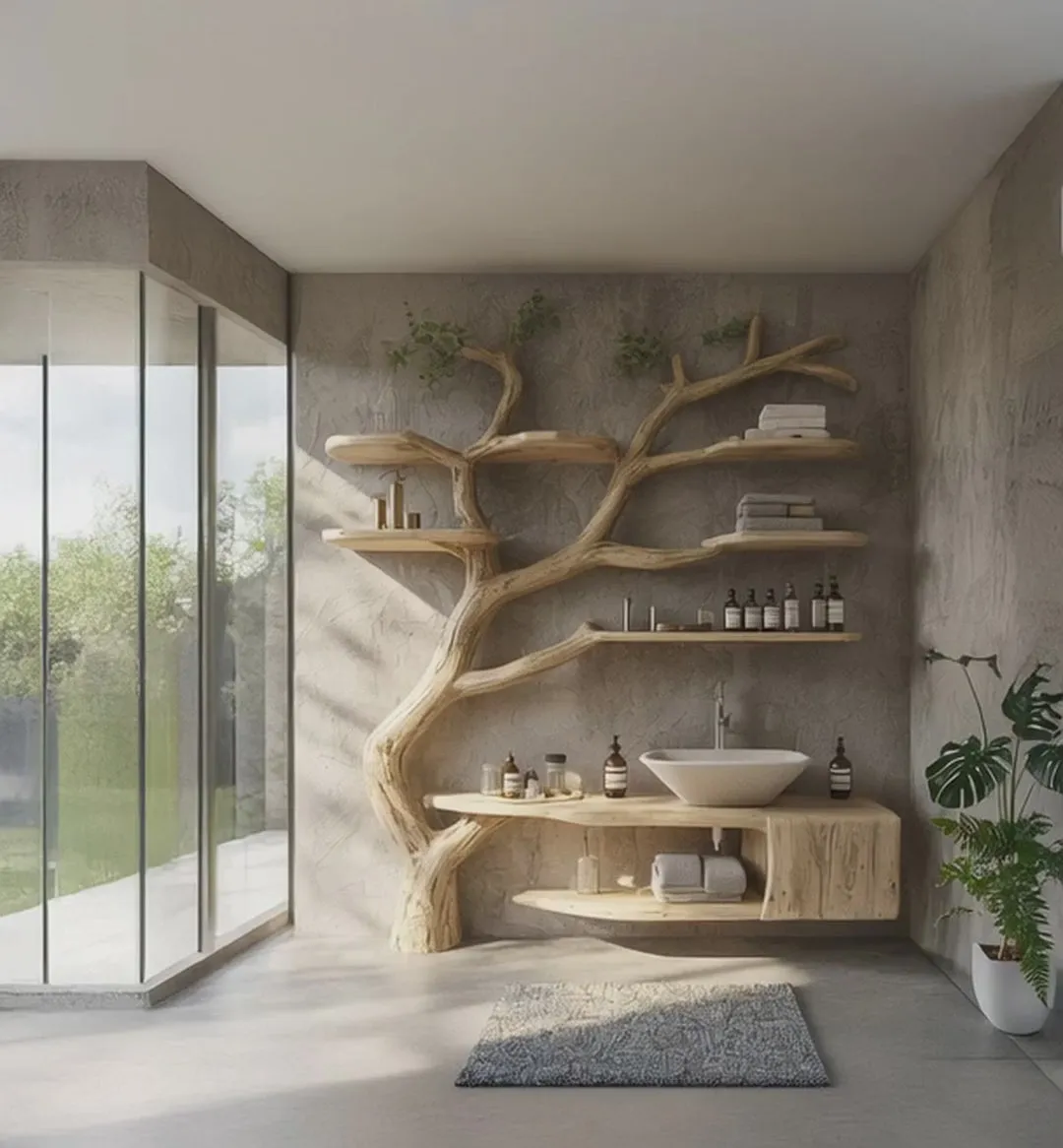 Each element of this hardwood console is carefully shaped and finished by hand, reflecting the dedication of true artisan craftsmanship. The wood is treated with a protective, low-sheen sealant that accentuates the natural grain and shields the surface from moisture, ensuring easy cleaning and maintenance. The floating shelves, while artistic, are structurally sound and securely mounted to the console’s frame or designed for seamless wall integration (detailed instructions provided). This unit provides an essential balance: the sturdy, dependable base of the washstand paired with the delicate, nature-inspired beauty of the branch storage. The console’s dimensions are thoughtfully scaled to ensure it fits elegantly into various bathroom sizes, from a large master suite to a spacious guest bath, maximizing both aesthetics and functionality. Choosing this unique furniture piece is an investment in durable design and unparalleled style, bringing the tranquility of the natural world directly into your home. (Approx. 475 words)